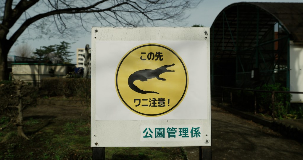 『この先、ワニ注意!』“Konosaki, Wani chui!”