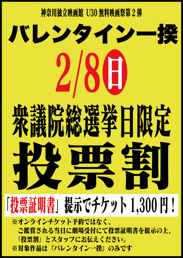 オンラインチケット予約ではなく、ご鑑賞される当日に劇場受付にて投票証明書を提示の上、「投票割」とスタッフにお伝えください。